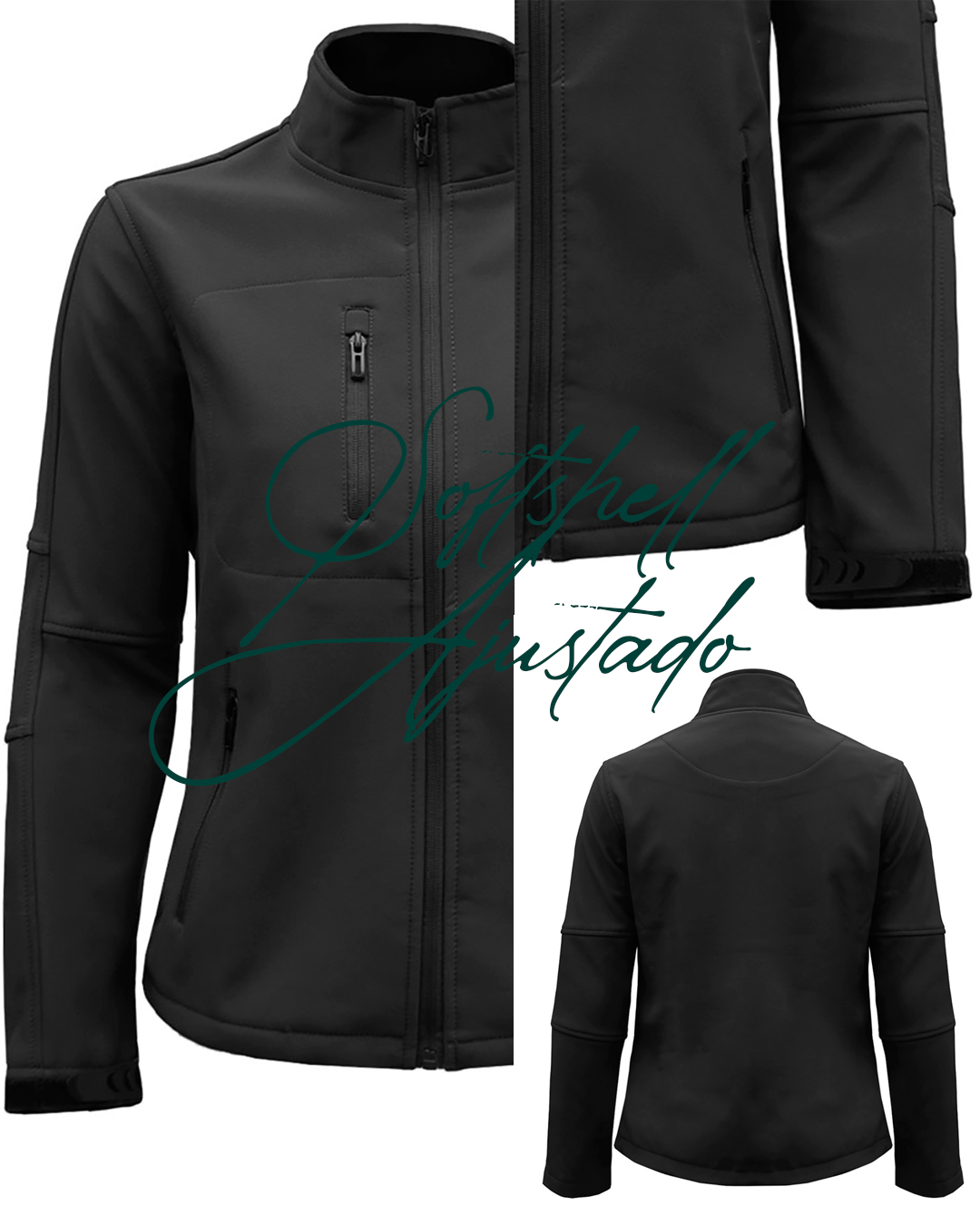 🧥 Chaqueta ajustada y estampado personalizado, softshell Composición externa: 92% poliéster, 8% spandex, Composición interna: 100% poliéster. Tejido externo: membrana softshell, Tejido interno: membrana micropolar, para uso outdoor, casual o corporativo, de calce ajustada, de cuello alto sin capucha, con cremallera frontal completa, bolsillos 2 laterales con cierre, 1 en pecho con cierre, pretina con cordón elástico ajustable y puños: velcro para ajustar